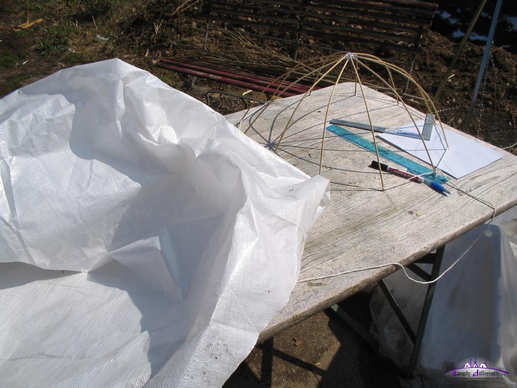 As next I did the rain cover, since I used natural material where the bending was defined by its elasticity I had to take the radius of each 5cm of the bent bow, and calculate the width (c/12) since I used 12 leafs, the same amount as I have bows. So here the styp-by-step: