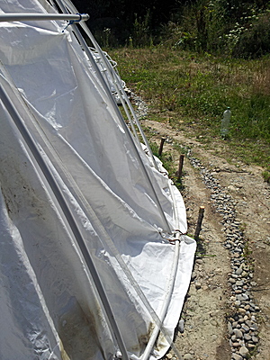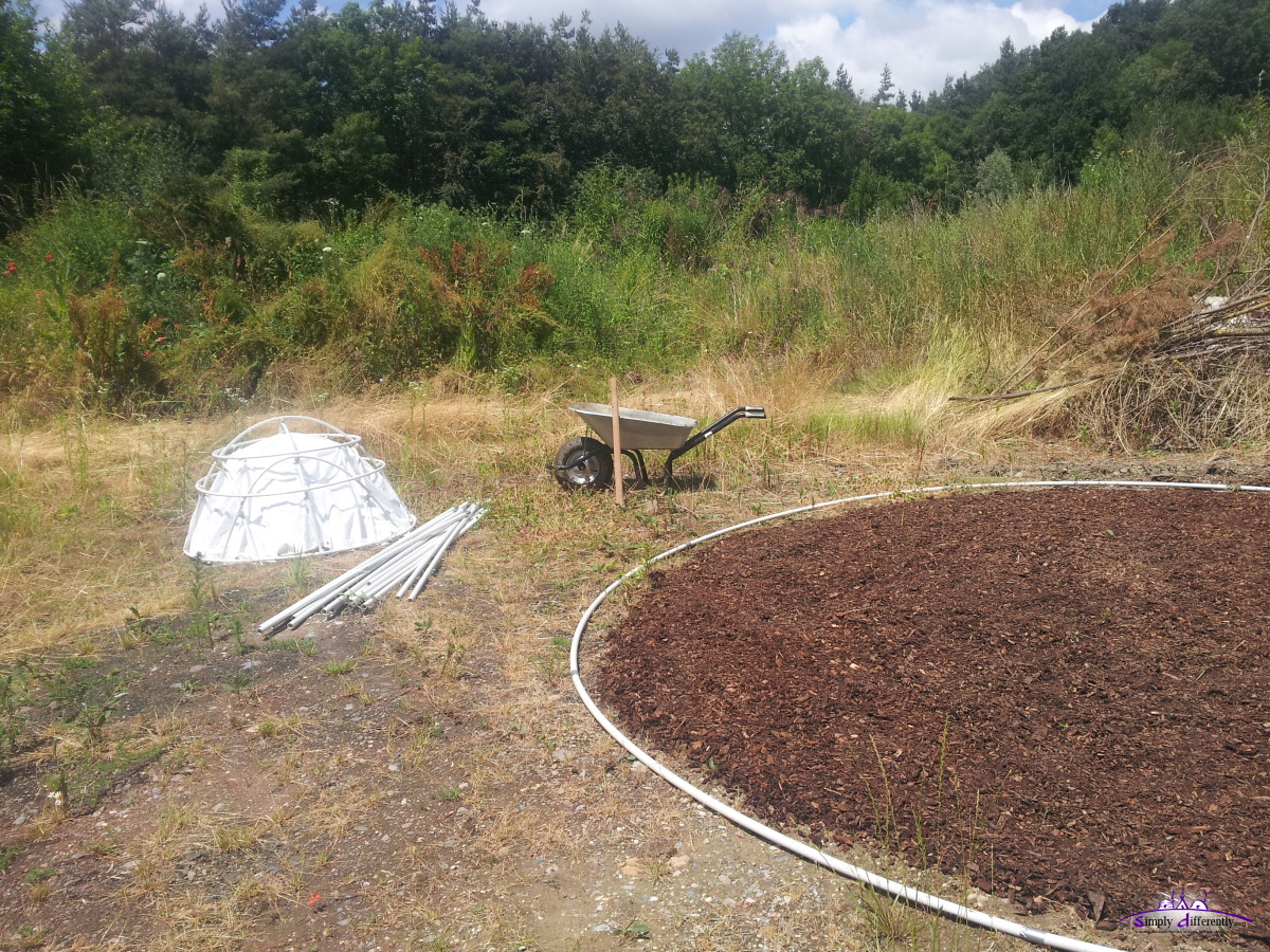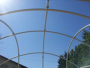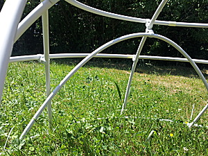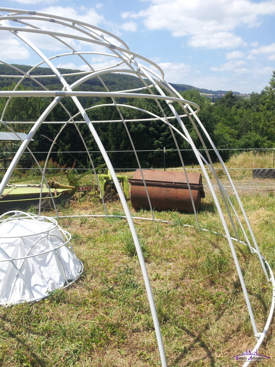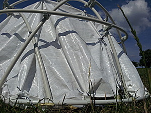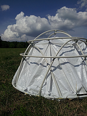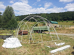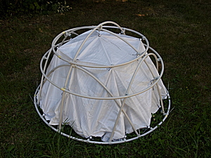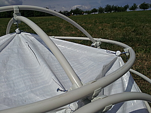 The 5m diameter dome with 4x 2m long 25mm diameter PVC conduits was not very stable, some stronger wind and it collapsed; only suitable for "good" weather.