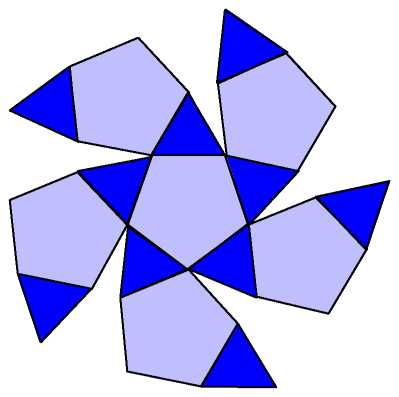 Optionally 5 bows of l/2 length can be used to cross over the top pentagon, and attached to the new formed pentagones around the side (not yet illustrated, but part of the original construction procedure mentioned above), it's suitable in case you plan no skylight.