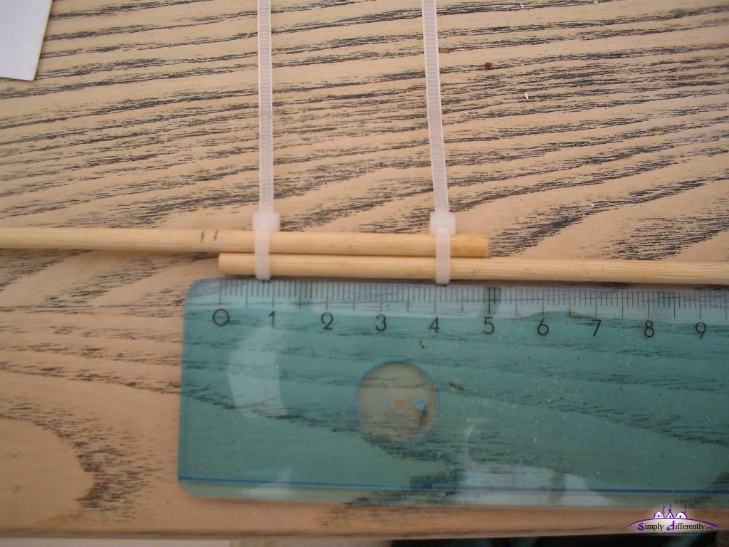 I have still some thick bamboo (2-2.5cm in diameter), and I tried to split it 4 times, but with a knife it didn't work that well and the resulting splits were very uneven. So, I used again my 40cm long and 4mm prefabricated bamboo splits (bought in a garden shop). I tied with with plastic cable binder, no glue.