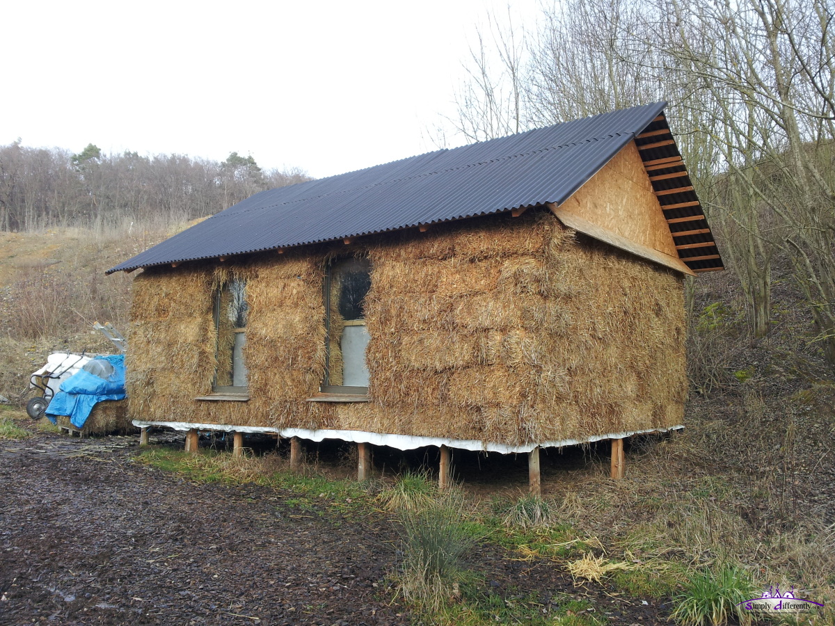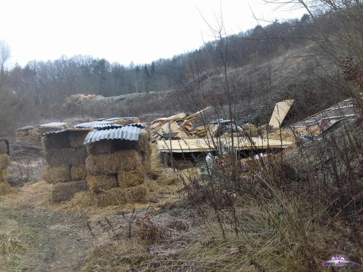 Some of the strawbale I piled up outside covered with a tarp I checked, and some began to rot due a small leak of the tarp - so I had to dispose the bales and scattered the open straw near by to provide some soil soon for gras on the slope behind the cabin (see photo).